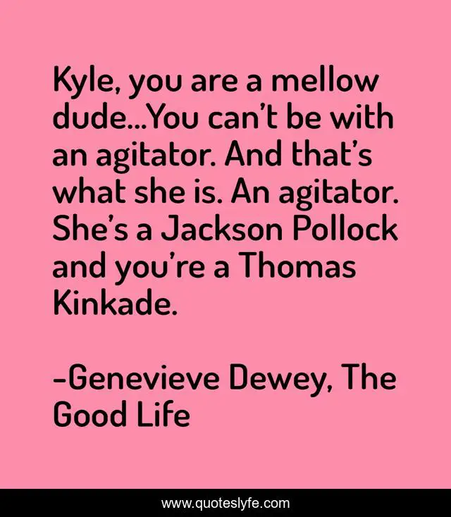 This page presents the quote "Kyle, you are a mellow dude...You can’t be with an agitator. And that’s what she is. An agitator. She’s a Jackson Pollock and you’re a Thomas Kinkade.". Author of this quote is Genevieve Dewey, The Good Life. This quote is about romance, romance-funny, romance-love, romance-novels,.