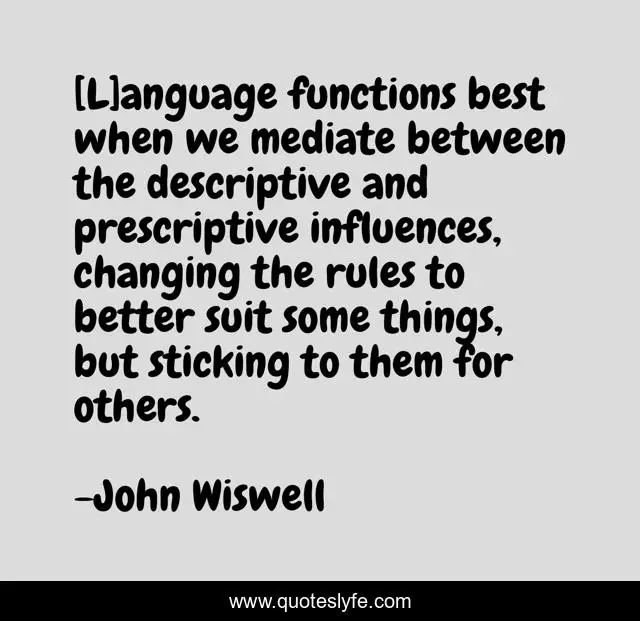 This page presents the quote "[L]anguage functions best when we mediate between the descriptive and prescriptive influences, changing the rules to better suit some things, but sticking to them for others.". Author of this quote is John Wiswell. .