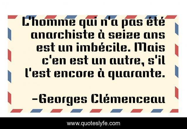 This page presents the quote "L'homme qui n'a pas été anarchiste à seize ans est un imbécile. Mais c'en est un autre, s'il l'est encore à quarante.". Author of this quote is Georges Clémenceau. This quote is about anarchism, wisdom,.