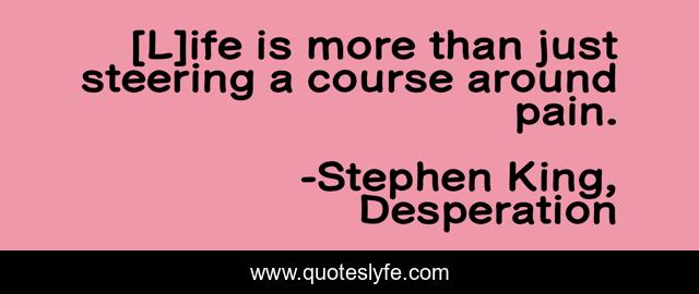 This page presents the quote "[L]ife is more than just steering a course around pain.". Author of this quote is Stephen King, Desperation. This quote is about life, philosophy, religion, courage, determinism, stephen-king,.