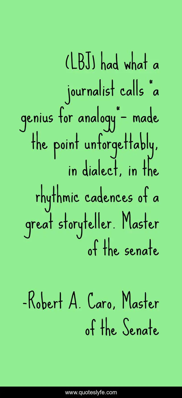 This page presents the quote "(LBJ) had what a journalist calls “a genius for analogy”— made the point unforgettably, in dialect, in the rhythmic cadences of a great storyteller. Master of the senate". Author of this quote is Robert A. Caro, Master of the Senate. This quote is about communication, charisma,.