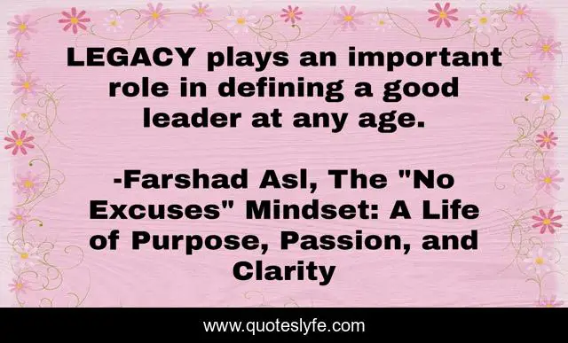 This page presents the quote "LEGACY plays an important role in defining a good leader at any age.". Author of this quote is Farshad Asl, The "No Excuses" Mindset: A Life of Purpose, Passion, and Clarity. This quote is about defining-role, leadership, legacy,.
