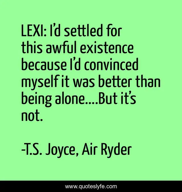 This page presents the quote "LEXI: I’d settled for this awful existence because I’d convinced myself it was better than being alone....But it’s not.". Author of this quote is T.S. Joyce, Air Ryder. This quote is about erotic-romance, shifter-romance, paranormal-shifter-romance, inspirational, self-help, enthusiasm,.