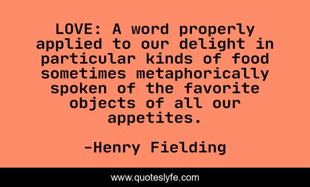 This page presents the quote "LOVE: A word properly applied to our delight in particular kinds of food sometimes metaphorically spoken of the favorite objects of all our appetites.". Author of this quote is Henry Fielding. This quote is about love, sometimes, favorite, affection,.