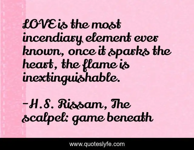 "H.S. Rissam, The scalpel: game beneath Quotes." Quoteslyfe.com, 2025. Fri. 05 Dec. 2025. <https://www.quoteslyfe.com/quote/LOVE-is-the-most-incendiary-element-ever-100506>.