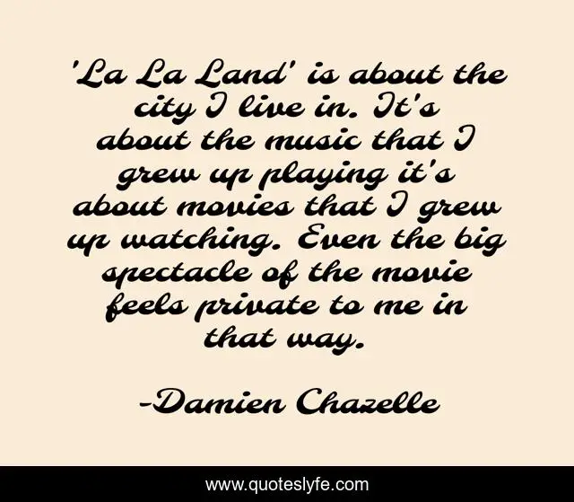 This page presents the quote "'La La Land' is about the city I live in. It's about the music that I grew up playing it's about movies that I grew up watching. Even the big spectacle of the movie feels private to me in that way.". Author of this quote is Damien Chazelle. This quote is about me, city, music,.