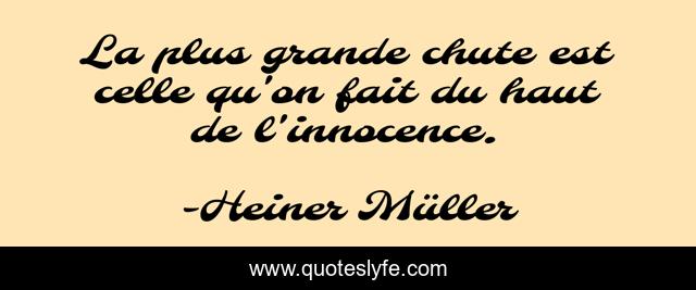 This page presents the quote "La plus grande chute est celle qu'on fait du haut de l'innocence.". Author of this quote is Heiner Müller. This quote is about enthusiasm, inspirational, writing,.