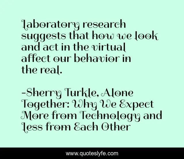 This page presents the quote "Laboratory research suggests that how we look and act in the virtual affect our behavior in the real.". Author of this quote is Sherry Turkle, Alone Together: Why We Expect More from Technology and Less from Each Other. This quote is about imagination, thought-life, discipleship, vision, spiritual-warfare,.
