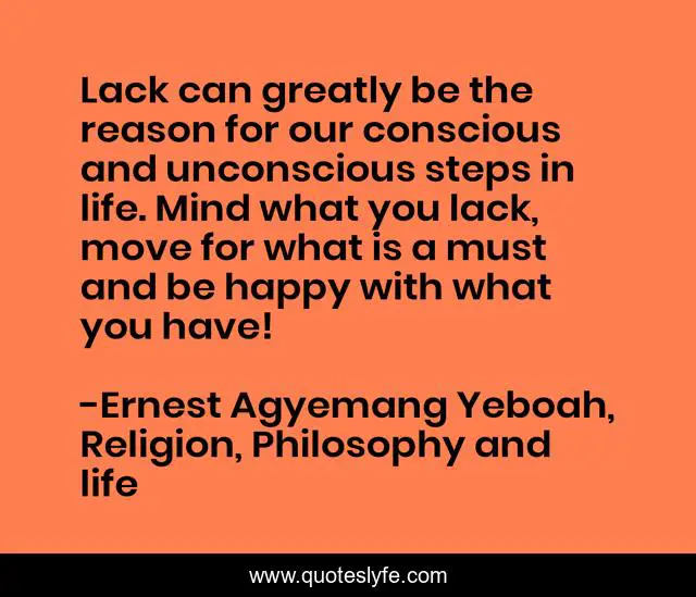 This page presents the quote "Lack can greatly be the reason for our conscious and unconscious steps in life. Mind what you lack, move for what is a must and be happy with what you have!". Author of this quote is Ernest Agyemang Yeboah, Religion, Philosophy and life. This quote is about envy, do-something, enmity, lack, reasons-why, reasons-for-action, be-happy-with-what-you-have,.