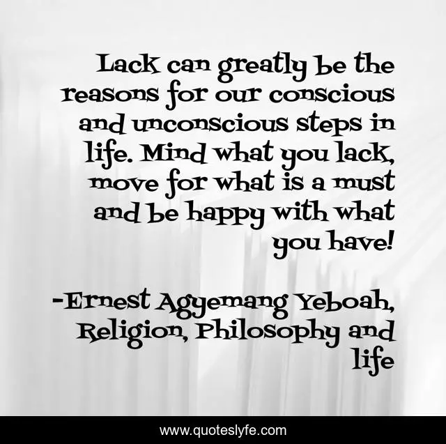 This page presents the quote "Lack can greatly be the reasons for our conscious and unconscious steps in life. Mind what you lack, move for what is a must and be happy with what you have!". Author of this quote is Ernest Agyemang Yeboah, Religion, Philosophy and life. This quote is about envy, do-something, enmity, lack, reasons-why, reasons-for-action, be-happy-with-what-you-have,.