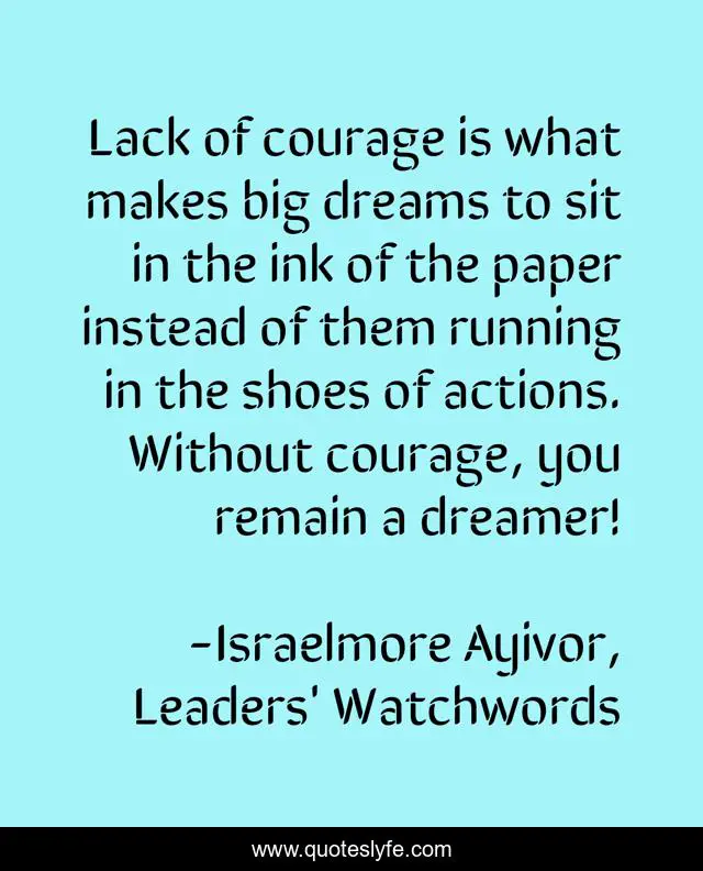 This page presents the quote "Lack of courage is what makes big dreams to sit in the ink of the paper instead of them running in the shoes of actions. Without courage, you remain a dreamer!". Author of this quote is Israelmore Ayivor, Leaders' Watchwords. This quote is about dream-big, be-bold, actions, paper, shoe, fear-not, ink, fear, write-down-the-vision,.