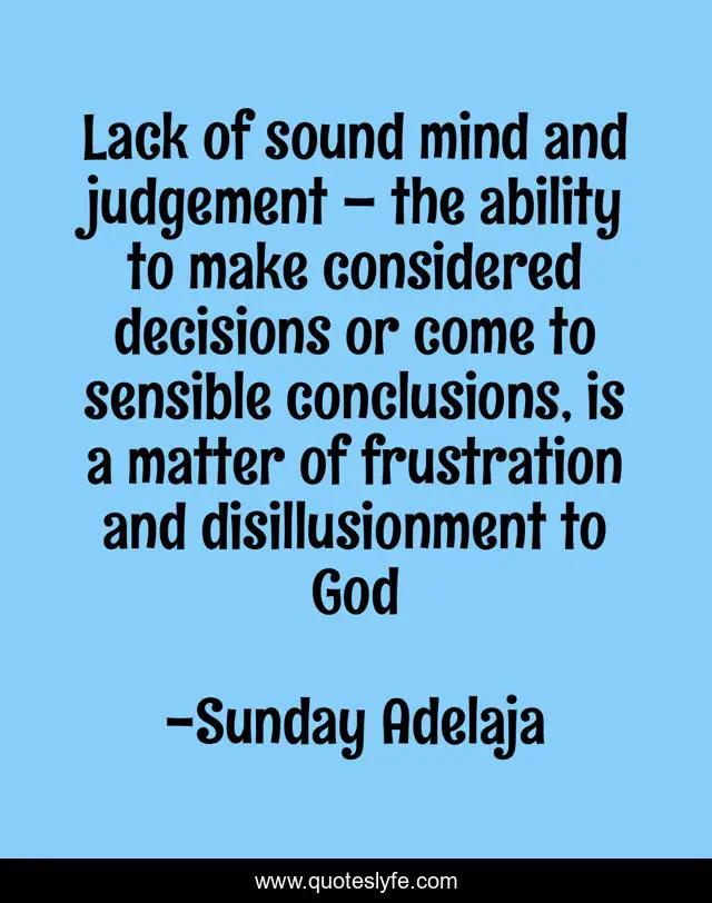 This page presents the quote "Lack of sound mind and judgement – the ability to make considered decisions or come to sensible conclusions, is a matter of frustration and disillusionment to God". Author of this quote is Sunday Adelaja. This quote is about ability, disillusionment, sound-mind, judgement, frustration, decisions, conclusion,.