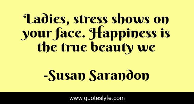 This page presents the quote "Ladies, stress shows on your face. Happiness is the true beauty we". Author of this quote is Susan Sarandon. This quote is about beauty, enthusiasm, stress, happiness, inspirational,.