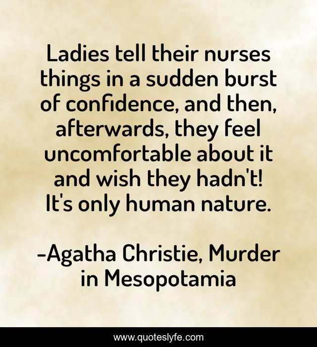 This page presents the quote "Ladies tell their nurses things in a sudden burst of confidence, and then, afterwards, they feel uncomfortable about it and wish they hadn't! It's only human nature.". Author of this quote is Agatha Christie, Murder in Mesopotamia. This quote is about human-nature, nurse, regret, confiding,.