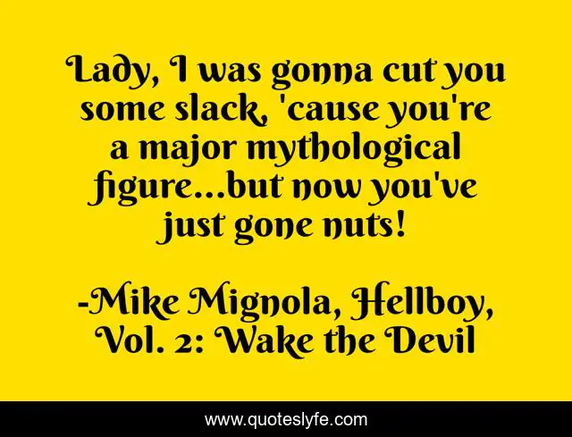 This page presents the quote "Lady, I was gonna cut you some slack, 'cause you're a major mythological figure...but now you've just gone nuts!". Author of this quote is Mike Mignola, Hellboy, Vol. 2: Wake the Devil. This quote is about mythology, humor,.