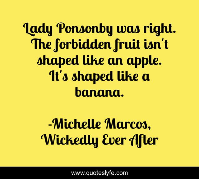 This page presents the quote "Lady Ponsonby was right. The forbidden fruit isn't shaped like an apple. It's shaped like a banana.". Author of this quote is Michelle Marcos, Wickedly Ever After. This quote is about romance, girl-talk, humor,.