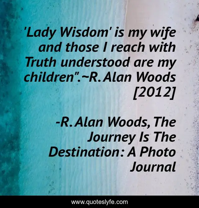 This page presents the quote "'Lady Wisdom' is my wife and those I reach with Truth understood are my children".~R. Alan Woods [2012]". Author of this quote is R. Alan Woods, The Journey Is The Destination: A Photo Journal. This quote is about lady-wisdom, r-alan-woods, wisdom,.