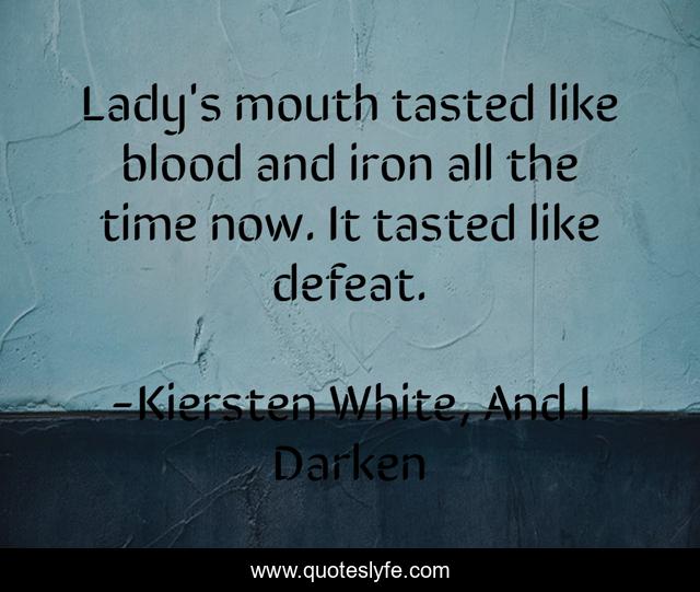 This page presents the quote "Lady's mouth tasted like blood and iron all the time now. It tasted like defeat.". Author of this quote is Kiersten White, And I Darken. This quote is about ya, historical-fiction,.