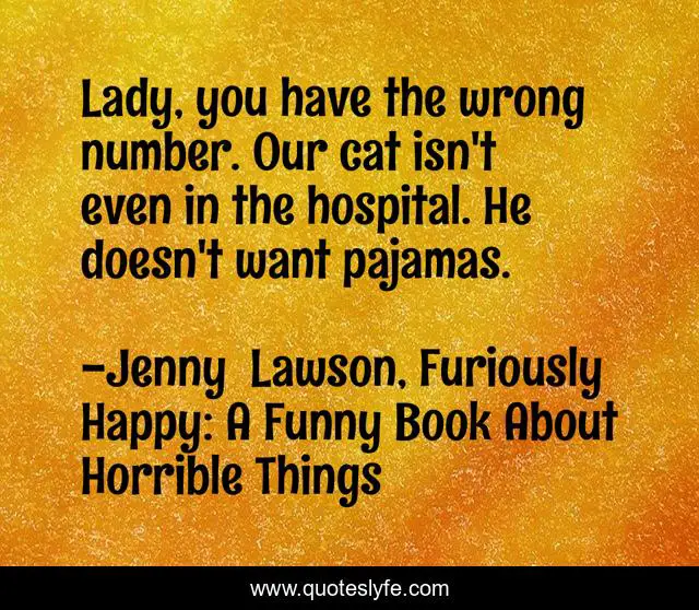 This page presents the quote "Lady, you have the wrong number. Our cat isn't even in the hospital. He doesn't want pajamas.". Author of this quote is Jenny Lawson, Furiously Happy: A Funny Book About Horrible Things. This quote is about lady, humor, jenny-lawson, victor-lawson, pajamas, hospital, number, cat, wrong,.