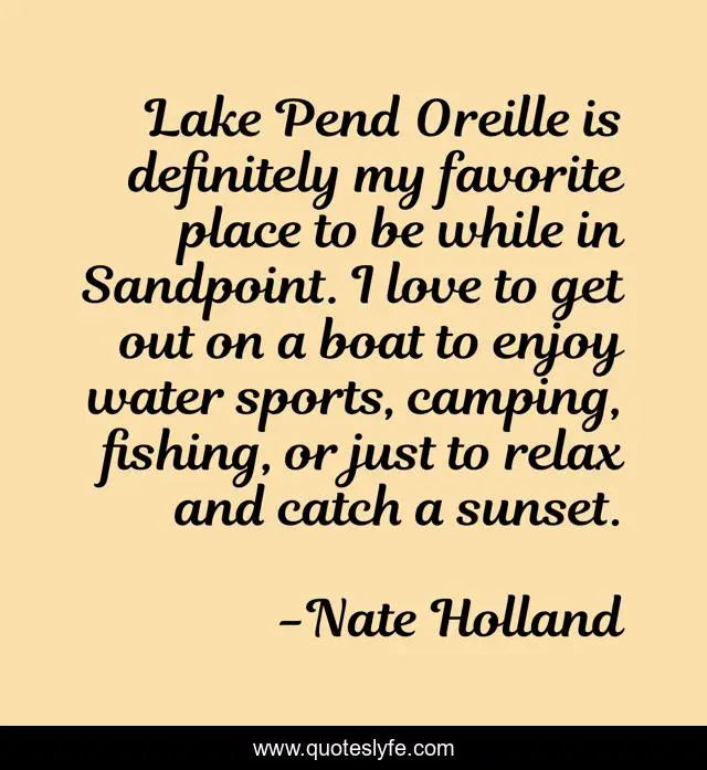 This page presents the quote "Lake Pend Oreille is definitely my favorite place to be while in Sandpoint. I love to get out on a boat to enjoy water sports, camping, fishing, or just to relax and catch a sunset.". Author of this quote is Nate Holland. This quote is about water, love, sunset, affection,.