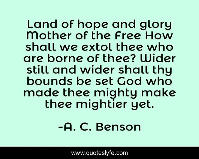 This page presents the quote "Land of hope and glory Mother of the Free How shall we extol thee who are borne of thee? Wider still and wider shall thy bounds be set God who made thee mighty make thee mightier yet.". Author of this quote is A. C. Benson. This quote is about , england, k, u,.