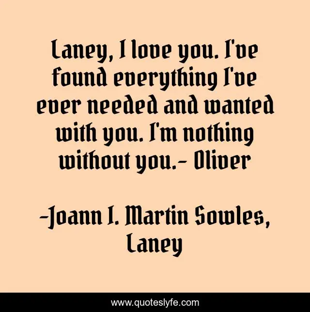 This page presents the quote "Laney, I love you. I've found everything I've ever needed and wanted with you. I'm nothing without you.- Oliver". Author of this quote is Joann I. Martin Sowles, Laney. This quote is about brookehaven, oliver, vampire, laney,.