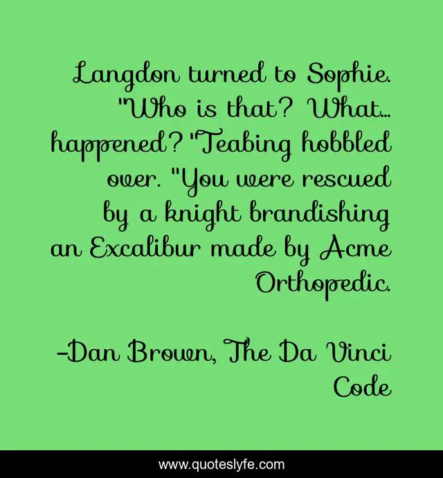 This page presents the quote "Langdon turned to Sophie. "Who is that? What... happened?"Teabing hobbled over. "You were rescued by a knight brandishing an Excalibur made by Acme Orthopedic.". Author of this quote is Dan Brown, The Da Vinci Code. .