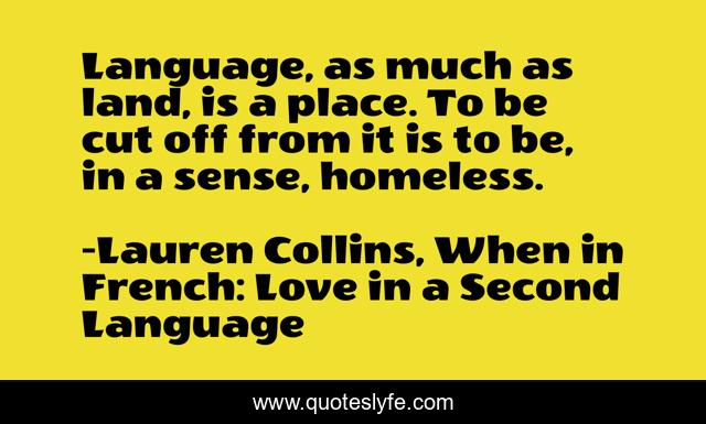 This page presents the quote "Language, as much as land, is a place. To be cut off from it is to be, in a sense, homeless.". Author of this quote is Lauren Collins, When in French: Love in a Second Language. This quote is about bilingualism, language,.