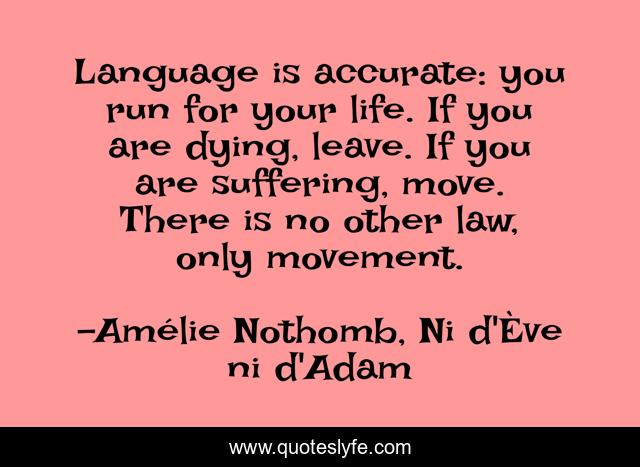This page presents the quote "Language is accurate: you run for your life. If you are dying, leave. If you are suffering, move. There is no other law, only movement.". Author of this quote is Amélie Nothomb, Ni d'Ève ni d'Adam. This quote is about suffering, move-on, survival, movement,.