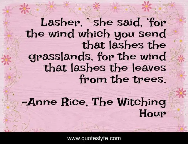This page presents the quote "Lasher, ’ she said, ‘for the wind which you send that lashes the grasslands, for the wind that lashes the leaves from the trees.". Author of this quote is Anne Rice, The Witching Hour. This quote is about witches, lasher,.