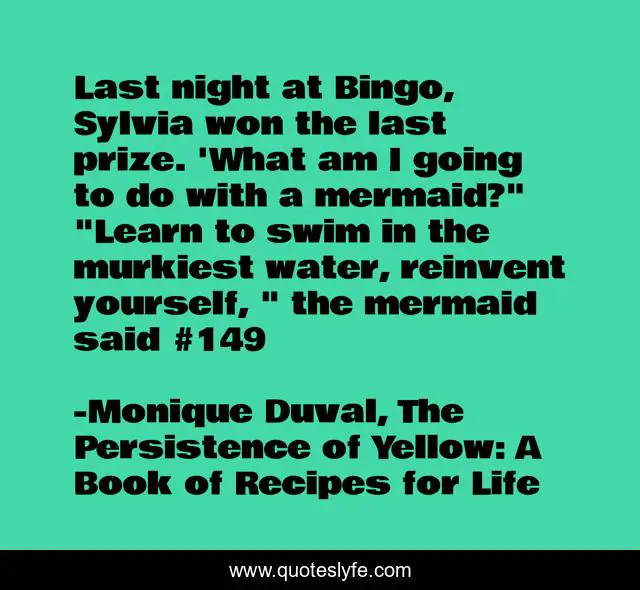 This page presents the quote "Last night at Bingo, Sylvia won the last prize. 'What am I going to do with a mermaid?" "Learn to swim in the murkiest water, reinvent yourself, " the mermaid said #149". Author of this quote is Monique Duval, The Persistence of Yellow: A Book of Recipes for Life. This quote is about enthusiasm, inspirational,.