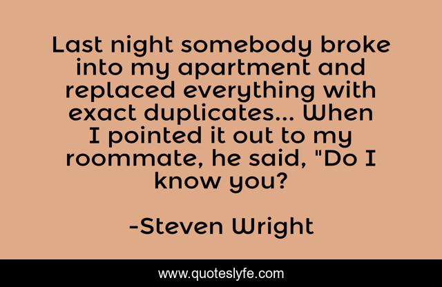 This page presents the quote "Last night somebody broke into my apartment and replaced everything with exact duplicates... When I pointed it out to my roommate, he said, "Do I know you?". Author of this quote is Steven Wright. .
