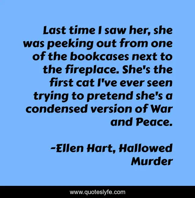 This page presents the quote "Last time I saw her, she was peeking out from one of the bookcases next to the fireplace. She's the first cat I've ever seen trying to pretend she's a condensed version of War and Peace.". Author of this quote is Ellen Hart, Hallowed Murder. This quote is about cats-and-dogs, funny, hide, humour, cats-vs-dogs, cat, cats, humor, comedy,.