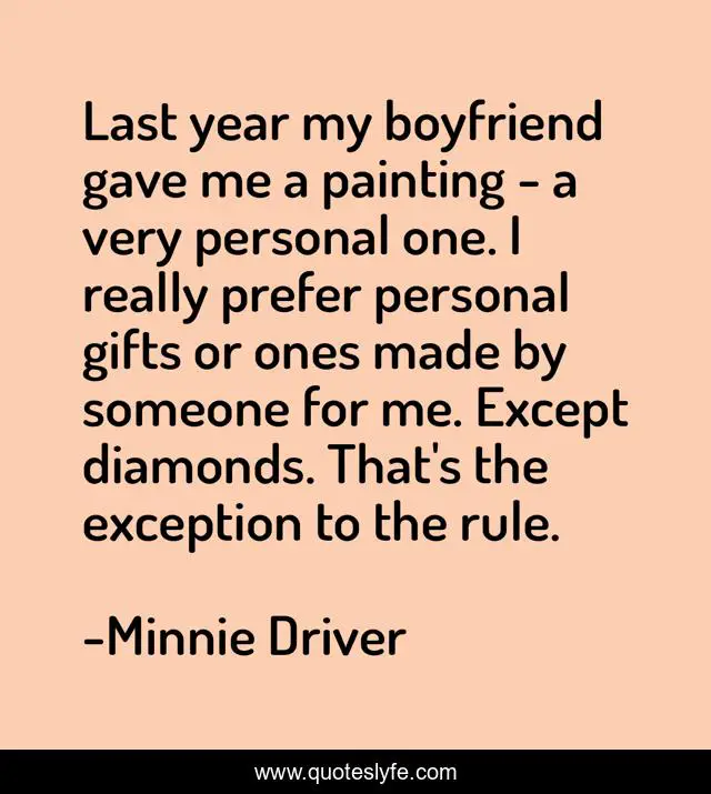 This page presents the quote "Last year my boyfriend gave me a painting - a very personal one. I really prefer personal gifts or ones made by someone for me. Except diamonds. That's the exception to the rule.". Author of this quote is Minnie Driver. This quote is about me, painting, diamonds,.