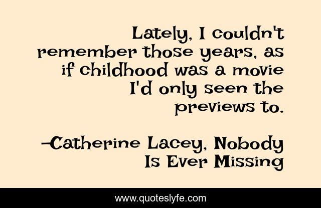 This page presents the quote "Lately, I couldn't remember those years, as if childhood was a movie I'd only seen the previews to.". Author of this quote is Catherine Lacey, Nobody Is Ever Missing. This quote is about simile, nobody-is-ever-missing, catherine-lacey, repressed-memories, memory, childhood,.