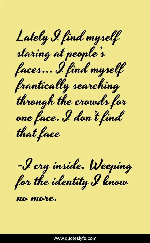 "I cry inside. Weeping for the identity I know no more. Quotes." Quoteslyfe.com, 2025. Mon. 08 Dec. 2025. <https://www.quoteslyfe.com/quote/Lately-I-find-myself-staring-at-people-246040>.