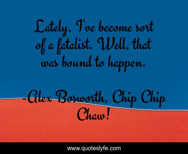 This page presents the quote "Lately, I've become sort of a fatalist. Well, that was bound to happen.". Author of this quote is Alex Bosworth, Chip Chip Chaw!. This quote is about philosophy-fatalism, fate,.