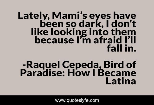 This page presents the quote "Lately, Mami’s eyes have been so dark, I don’t like looking into them because I’m afraid I’ll fall in.". Author of this quote is Raquel Cepeda, Bird of Paradise: How I Became Latina. This quote is about stress, darkness, eyes, mami, rocio, family-relationships, mothers-and-daughters,.