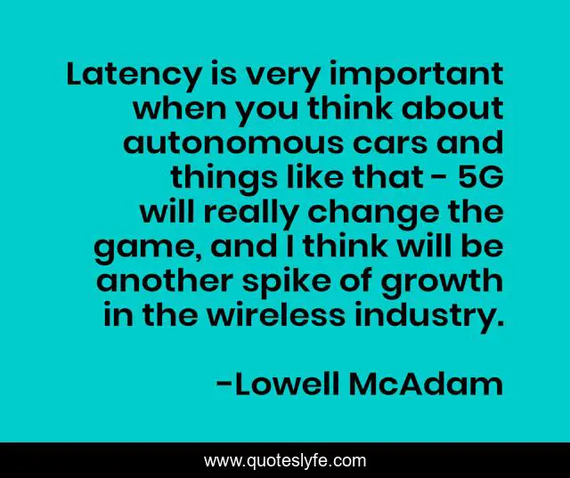 This page presents the quote "Latency is very important when you think about autonomous cars and things like that - 5G will really change the game, and I think will be another spike of growth in the wireless industry.". Author of this quote is Lowell McAdam. This quote is about game, growth, change,.
