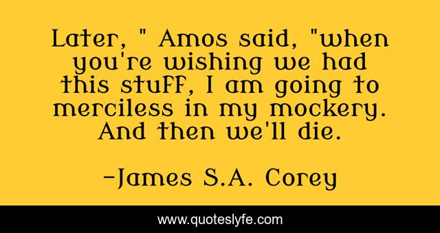 This page presents the quote "Later, " Amos said, "when you're wishing we had this stuff, I am going to merciless in my mockery. And then we'll die.". Author of this quote is James S.A. Corey. .