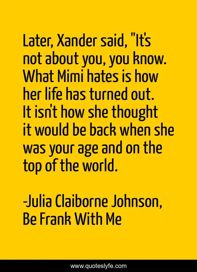 This page presents the quote "Later, Xander said, "It's not about you, you know. What Mimi hates is how her life has turned out. It isn't how she thought it would be back when she was your age and on the top of the world.". Author of this quote is Julia Claiborne Johnson, Be Frank With Me. This quote is about anger, regrets,.