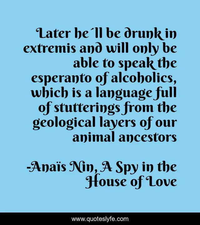 This page presents the quote "Later he´ll be drunk in extremis and will only be able to speak the esperanto of alcoholics, which is a language full of stutterings from the geological layers of our animal ancestors". Author of this quote is Anaïs Nin, A Spy in the House of Love. .