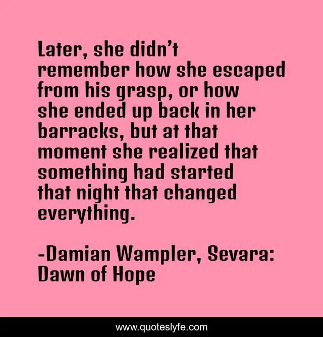 This page presents the quote "Later, she didn’t remember how she escaped from his grasp, or how she ended up back in her barracks, but at that moment she realized that something had started that night that changed everything.". Author of this quote is Damian Wampler, Sevara: Dawn of Hope. .