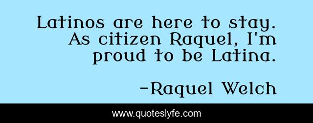 This page presents the quote "Latinos are here to stay. As citizen Raquel, I'm proud to be Latina.". Author of this quote is Raquel Welch. This quote is about politics, inspirational, enthusiasm,.