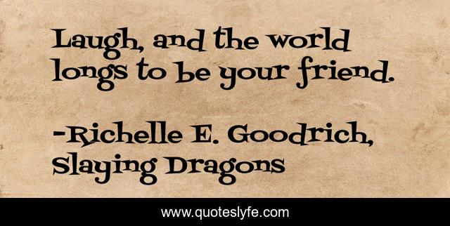 This page presents the quote "Laugh, and the world longs to be your friend.". Author of this quote is Richelle E. Goodrich, Slaying Dragons. This quote is about making-friends, friendship, richelle, laugh, richelle-e-goodrich, laughter, richelle-goodrich, friends, friend,.