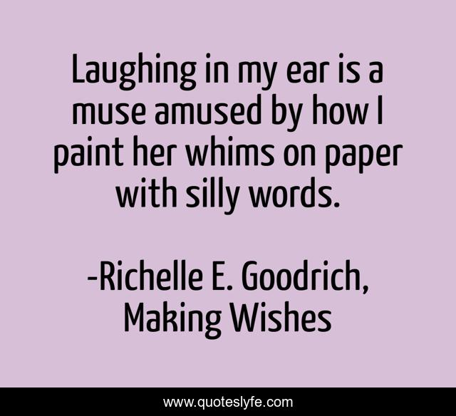This page presents the quote "Laughing in my ear is a muse amused by how I paint her whims on paper with silly words.". Author of this quote is Richelle E. Goodrich, Making Wishes. This quote is about richelle-goodrich, writing-process, richelle, muse, writing,.
