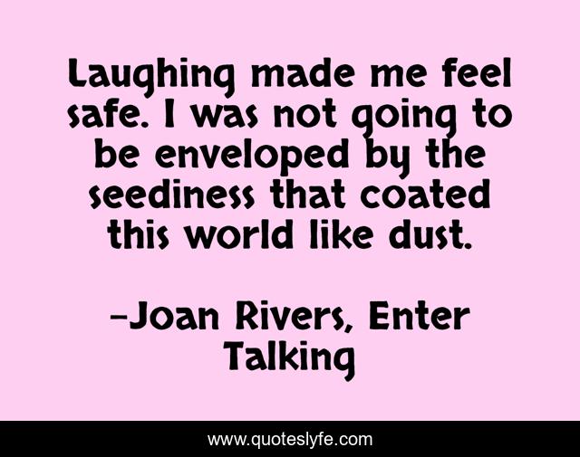 This page presents the quote "Laughing made me feel safe. I was not going to be enveloped by the seediness that coated this world like dust.". Author of this quote is Joan Rivers, Enter Talking. This quote is about humour, performers, writing, brooklyn, nyc, comedy,.