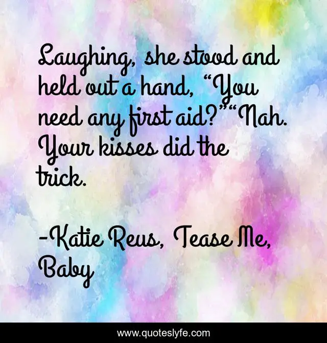 This page presents the quote "Laughing, she stood and held out a hand, “You need any first aid?”“Nah. Your kisses did the trick.". Author of this quote is Katie Reus, Tease Me, Baby. .