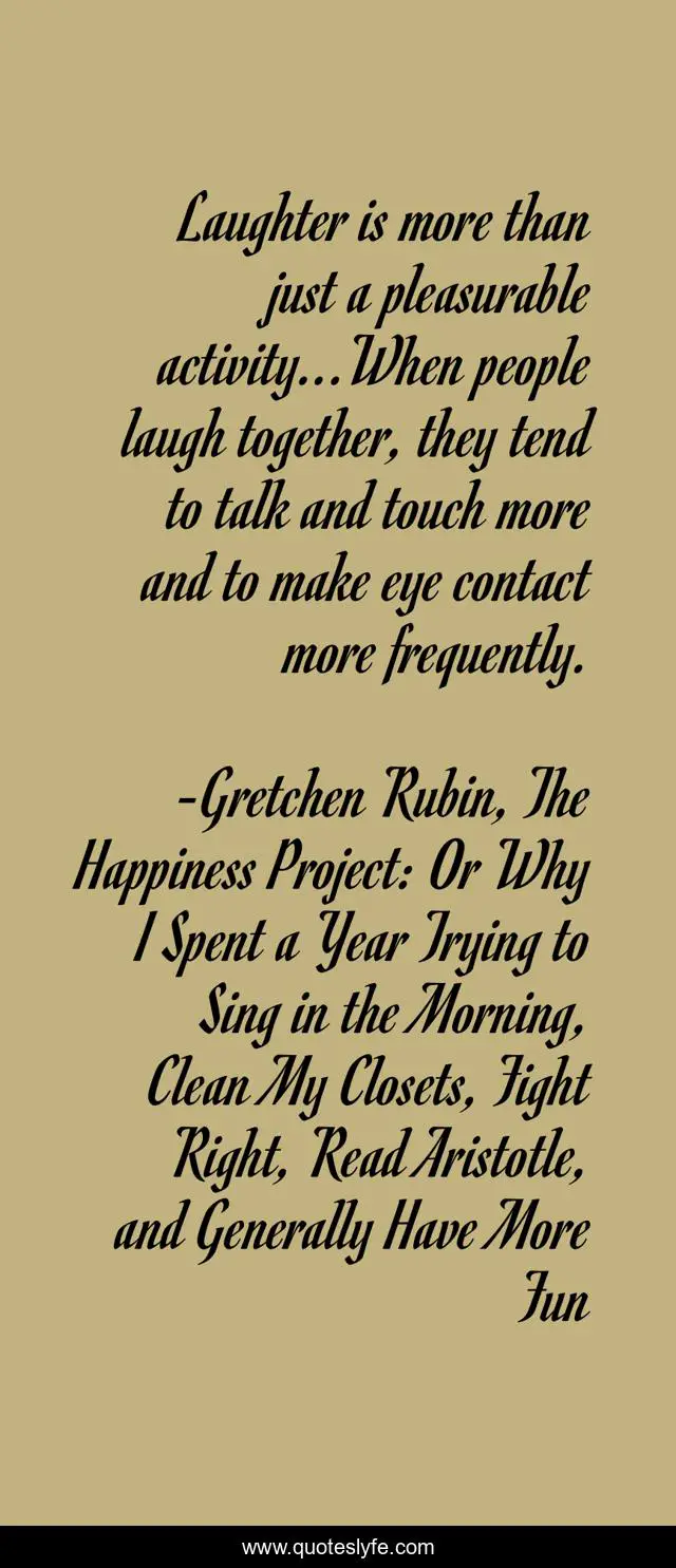 This page presents the quote "Laughter is more than just a pleasurable activity...When people laugh together, they tend to talk and touch more and to make eye contact more frequently.". Author of this quote is Gretchen Rubin, The Happiness Project: Or Why I Spent a Year Trying to Sing in the Morning, Clean My Closets, Fight Right, Read Aristotle, and Generally Have More Fun. This quote is about relationships, pleasure, laughter, affection, happiness,.
