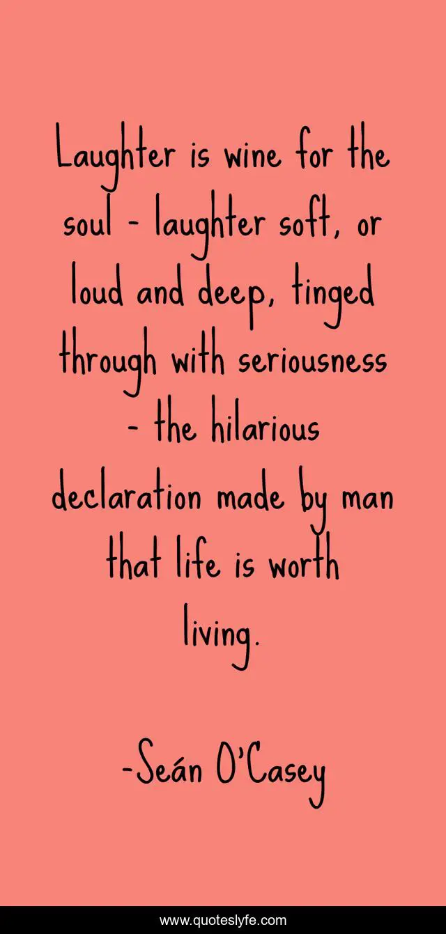 This page presents the quote "Laughter is wine for the soul - laughter soft, or loud and deep, tinged through with seriousness - the hilarious declaration made by man that life is worth living.". Author of this quote is Seán O'Casey. This quote is about joy, laughter,.